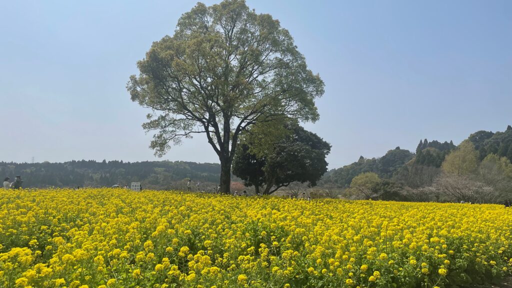 菜の花は春を代表する花のひとつですが、これほど広い範囲に咲き誇る様子を見る機会はなかなかありません。風が吹くたびに花がゆらゆらと揺れ、その動きがまるで波のように広がっていく光景はとても印象的でした。近くには大きな木もあり、その存在がアクセントとなって、自然の美しさをより一層引き立てているように感じました。